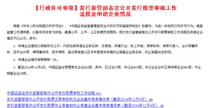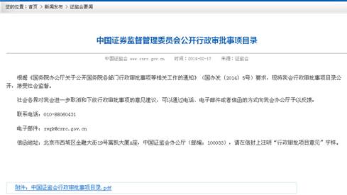 貫徹落實(shí)國務(wù)院有關(guān)工作要求,2014217日在網(wǎng)站全面公開(kāi)中國證監會(huì )行政審批事項目錄,公開(kāi)的內容包括項目編碼、審批部門(mén)、項目名稱(chēng)、設定依據、審批對象,以及收集社會(huì )各界對進(jìn)一步取消和下放行政審批項目意見(jiàn)的具體方式等,接受全社會(huì )監督。發(fā)布發(fā)行審核委員會(huì )工作會(huì )議公告和審核結果公告201期。發(fā)布上市公司并購重組審核委員會(huì )工作會(huì )議公告和審核結果公告160期。公開(kāi)行政許可批復1282件。公開(kāi)首次公開(kāi)發(fā)行企業(yè)信息披露質(zhì)量抽查抽簽情況及監管問(wèn)答等17期、預披露及補充預披露企業(yè)877家次。對首次公開(kāi)發(fā)行股票、上市公司并購重組、證券投資基金募集、證券機構、基金管理公司、資信評級機構等的行政許可事項受理及審核進(jìn)度情況每周予以更新發(fā)布。