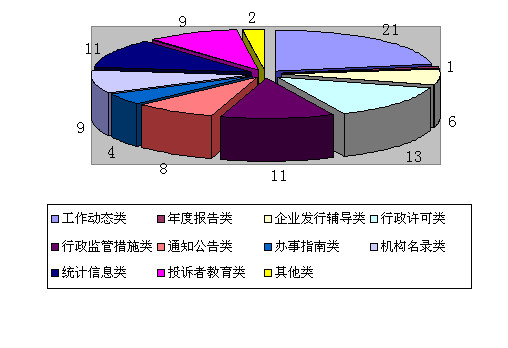 年,廣西證監局在局網(wǎng)站上主動(dòng)進(jìn)行公開(kāi)的信息有95條,其中,工作動(dòng)態(tài)類(lèi)信息21條,年度報告類(lèi)信息1條,企業(yè)發(fā)行輔導類(lèi)信息6條,行政許可類(lèi)信息13條,行政監管措施決定書(shū)11條,通知公告類(lèi)信息8條,辦事指南類(lèi)信息4條,機構名錄9條,統計信息11條,投資者教育類(lèi)信息9條,其他類(lèi)信息2條。(見(jiàn)圖3)