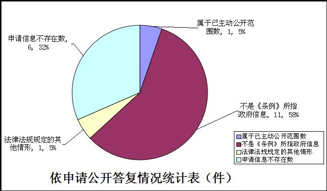 我局對收到的19件信息公開(kāi)申請全部進(jìn)行了答復,其中,重復申請合并辦理2件,起草答復文書(shū)17份。在法定期限內作出答復的17件,2件延期答復。對19件申請公開(kāi)事項中,屬于已主動(dòng)公開(kāi)范圍的1件,占5%;不同意公開(kāi)12件,其中,不是《條例》所指政府信息的11件,占58%, 法律法規規定的其他情形1件(因所涉及第三方不同意公開(kāi)),占5%;申請信息不存在的6件,占32%。
