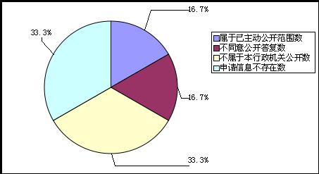我局對收到的6件信息公開(kāi)申請全部進(jìn)行了答復,其中,2件在法定期限內作出答復,4件延期答復。延期答復主要原因為申請人一次申請事項較多,涉及內容復雜。對6件申請公開(kāi)事項中,屬于已主動(dòng)公開(kāi)范圍的1件,占16.7%;不同意公開(kāi)1件,占16.7%;不屬于本機關(guān)公開(kāi)范圍內的2件,占 33.3%;申請信息不存在的2件,占33.3%。